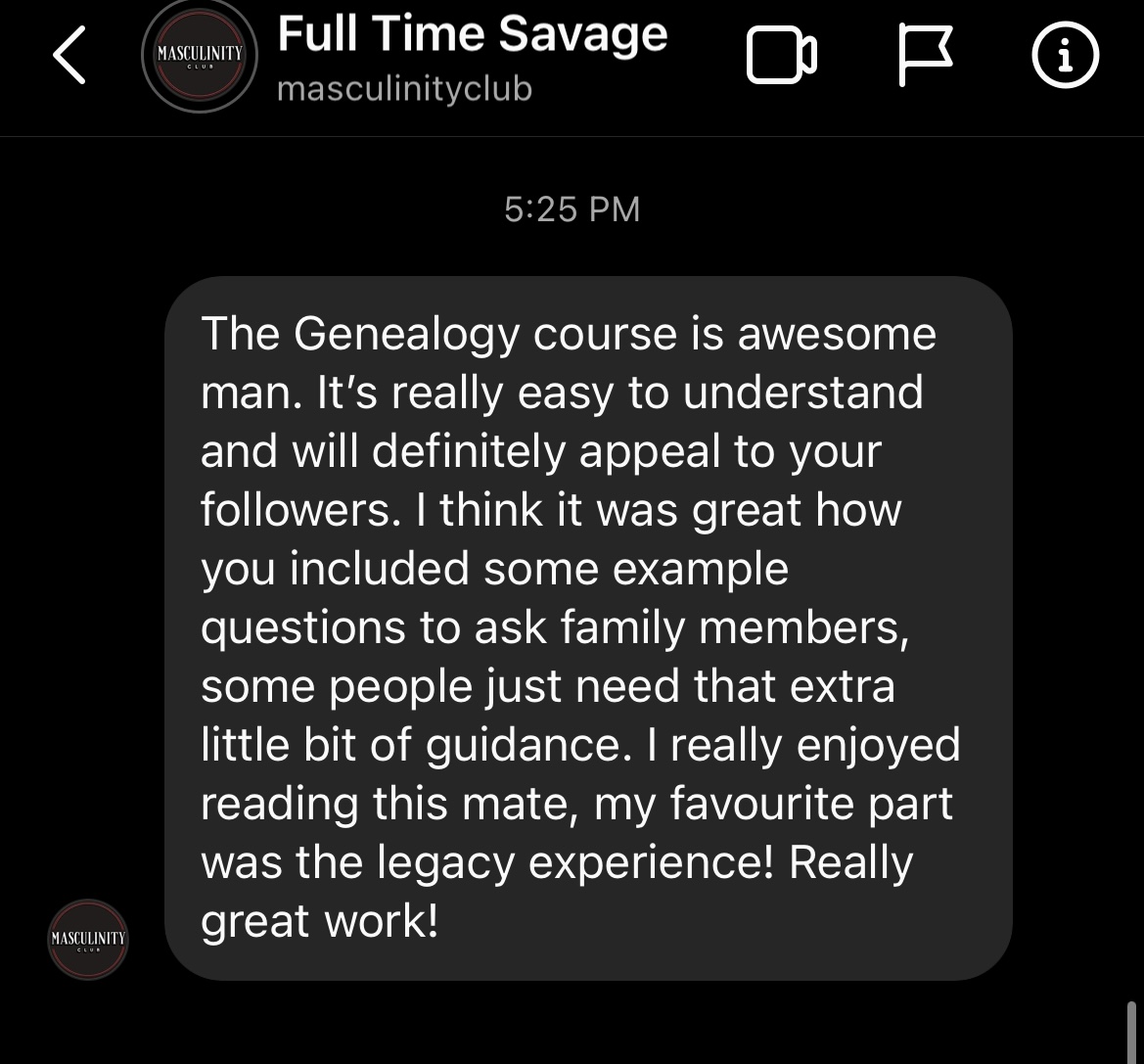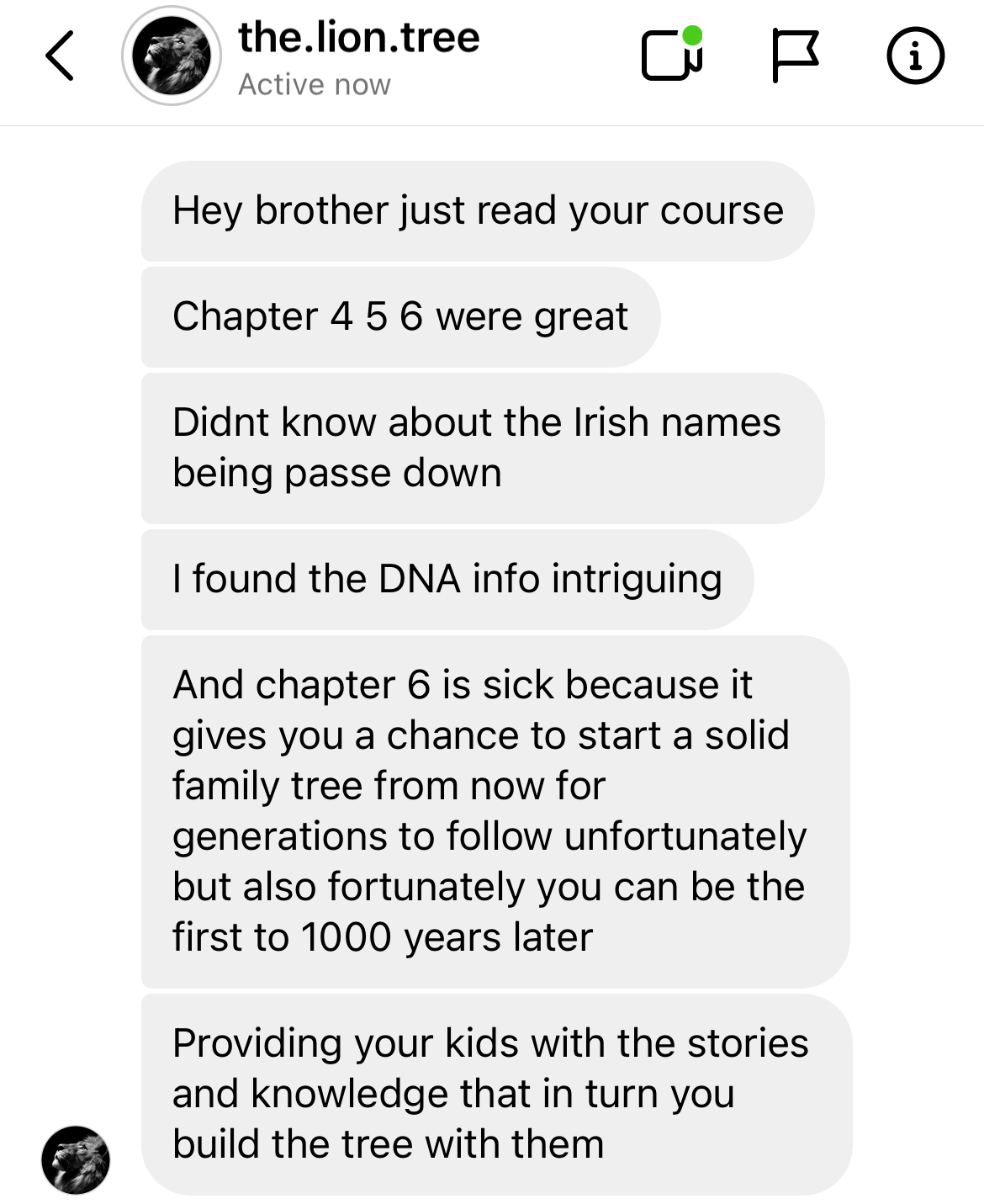 Someone reading this page will buy the course and discover royalty in their bloodline. Some will discover long lost relatives. Others will feel a deeper sense of identity and belonging. Some will build a legacy with their children, growing closer to their loved ones in a way that transcends time. I hope ALL of you get exactly what you want, and more.